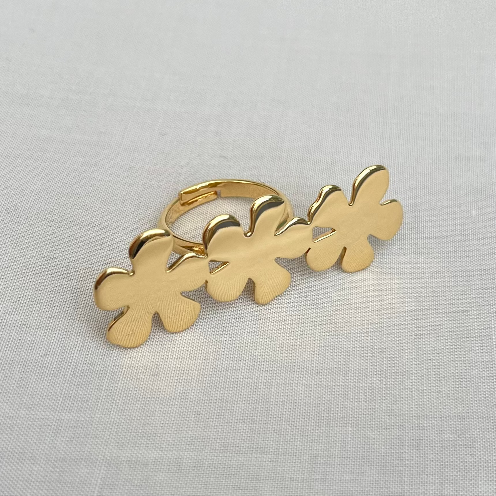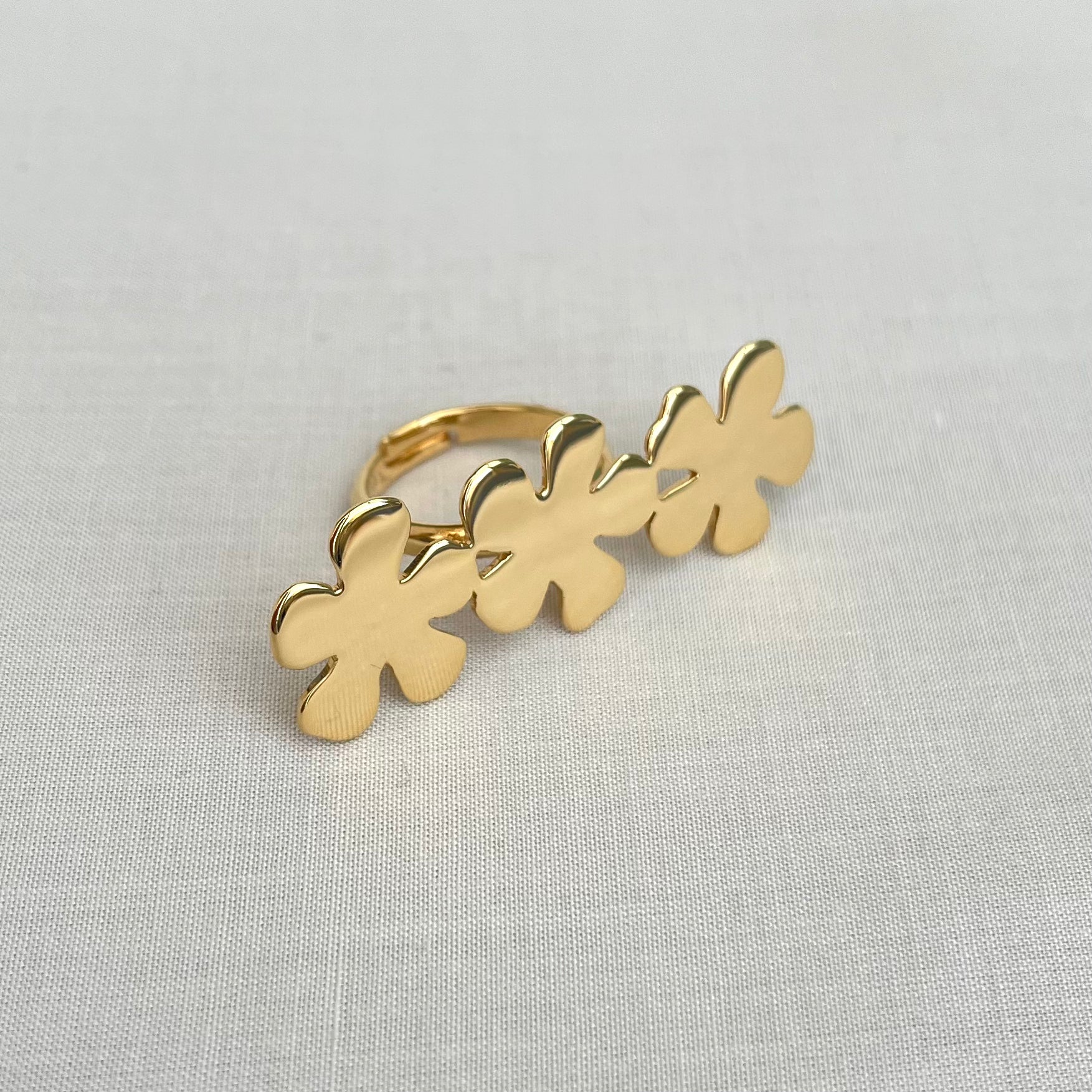 La bague Aria est une création signature, pensée comme un talisman végétal. Composée de trois boutons d’or, elle habille la main avec force, poésie et lumière.