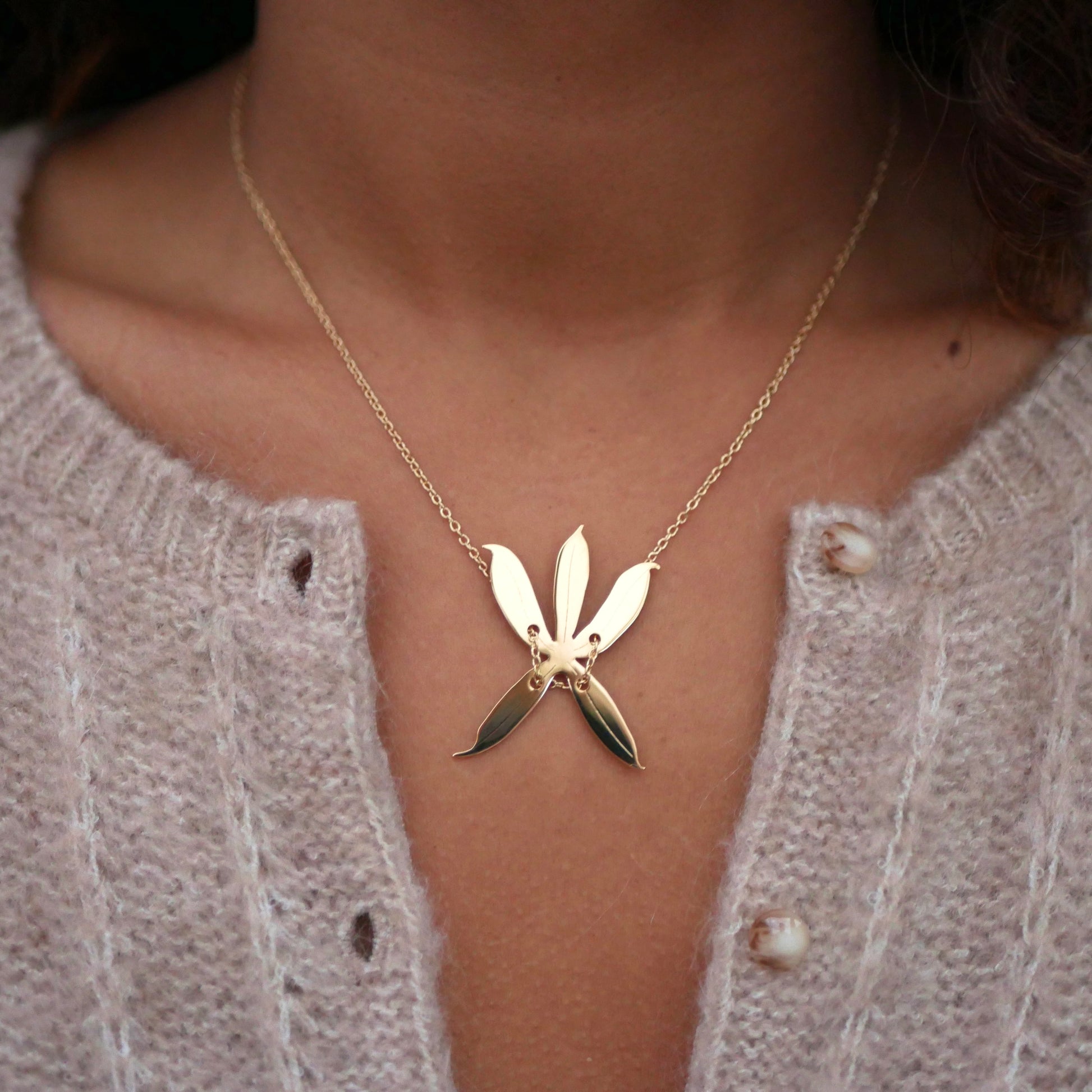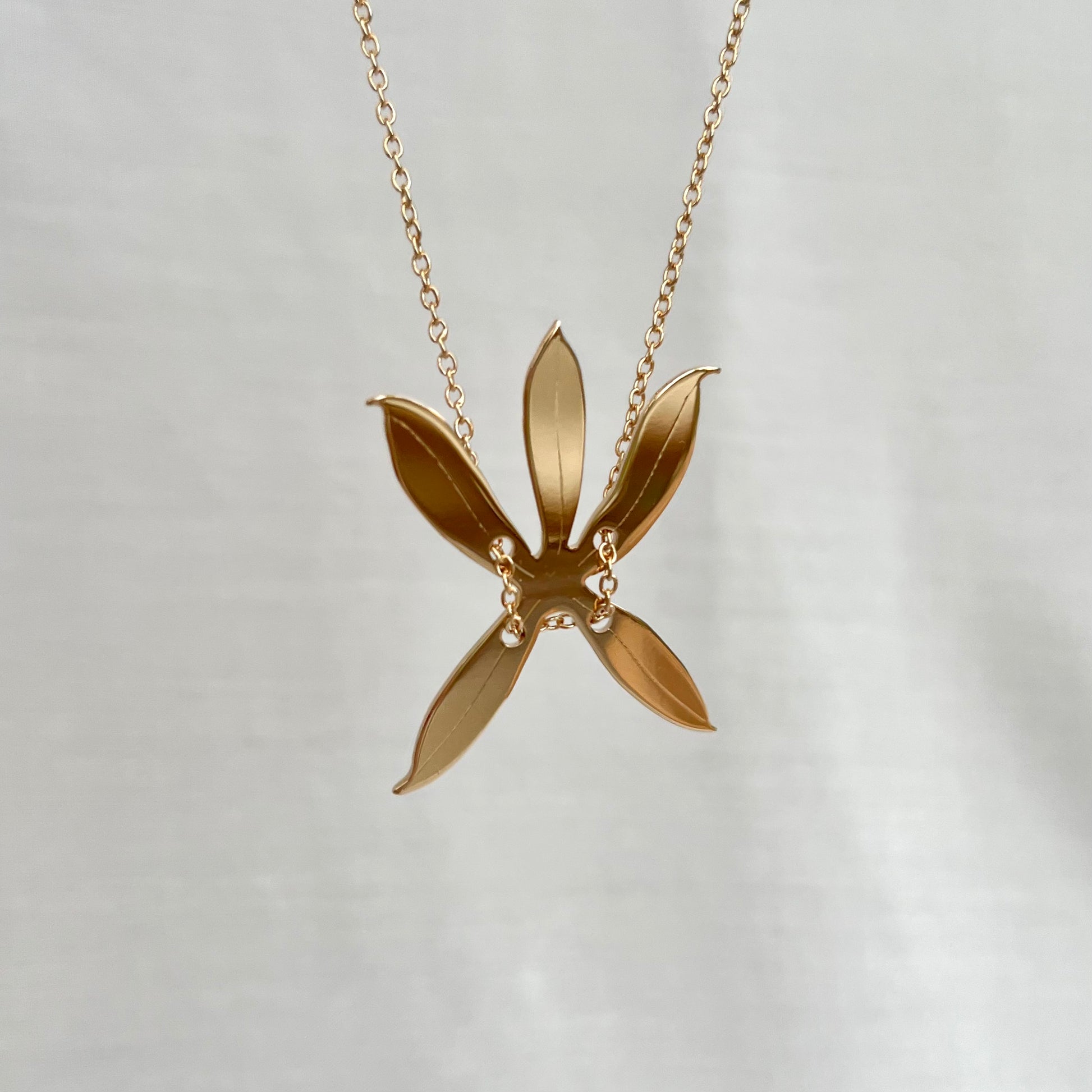 Né d’une fleur d’isotoma, symbole de calme et d’équilibre, Almé allie force et délicatesse. Sa chaîne traverse la fleur avec une légèreté aérienne, révélant un bijou sculptural. Les gravures fines sur chaque pétale rappellent les lignes naturelles de la fleur originelle.